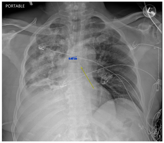 AP chest X-ray demonstrating DLT and infiltrated right lung with preservation of the left lung on admission to MICU. The yellow arrow demonstrates left bronchus intubation and a protected left lung compared to a patchy and opaque right lung from bilious contents entering the right airway.