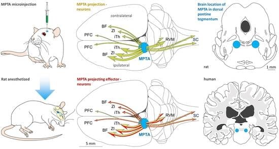 - Reiner, K.; Sukhotinsky, I.; Devor, M. Mesopontine tegmental anesthesia area projects independently to the rostromedial medulla and to the spinal cord. Neuroscience 2007, 146, 1355–1370. [Google Scholar] [CrossRef] [PubMed]