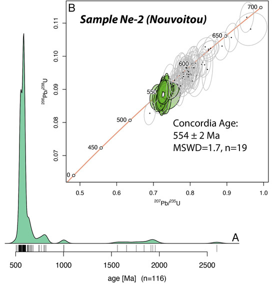 - Ballèvre, M.; Bosse, V.; Dabard, M.P.; Ducassou, C.; Fourcade, S.; Paquette, J.L.; Peucat, J.J.; Pitra, P. Histoire géologique du massif Armoricain: Actualité de la recherche. Bull. Soc. Géol. Minér. Bretagne 2013, 10–11, 5–96. [Google Scholar]