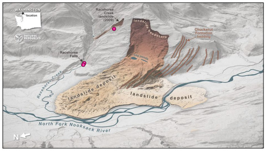 - Racehorse Creek, Washington Geologic Survey/Department of Natural Resources, Olympia, WA, USA. Available online: https://wa100.dnr.wa.gov/north-cascades/racehorse-creek (accessed on 2 February 2025).