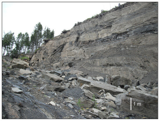 Research studies began soon after the 2009 landslide event, including investigations of the slide mechanism [1] and intensive paleontology research that continues to the present. Studies of Chuckanut Formation fossil footprints from other sites in the Mount Baker foothills [14,30,31,32] provided a regional perspective. At these localities, tracks were photographed in situ, with tracings made on clear vinyl sheets to record geometry. Three Rivavipes track slabs were collected by backpacking; the best example was transported by helicopter to a nearby road, where it was transported by truck to Western Washington University for public display. For slabs that were too large to transport, replicas were made using silicone or latex molds. Since 2009, several Rivavipes tracks have been obliterated by erosion, one was destroyed by an inept extraction attempt by an unauthorized amateur, and several footprint slabs remain at the site. Specimens, molds, and related materials are archived at the Western Washington University Geology Department in Bellingham, WA, USA.