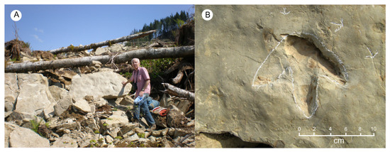 The first giant bird track (WWU-TR-66) that was discovered at Racehorse Creek Landslide. (A) Photo of the author with the in situ slab. Photo by Keith Kemplin, used with permission. (B) Chalk-marked outline of the tridactyl footprint, and three small shorebird tracks.