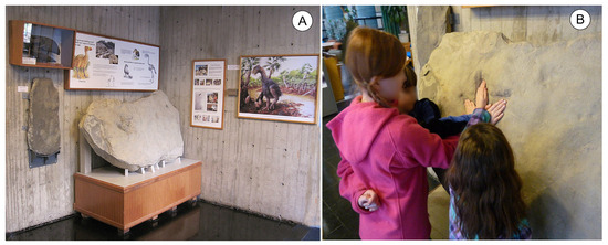 Display of gastornithid trace fossils at the Western Washington University Geology Department, Bellingham, Washington, USA. (A) Display Gastornis tracks from Racehorse Creek Landslide. These are a two-track slab, WWU-TR-57, and the holotype, WWU-TR-66. (B) Local school children explore the type specimen. 2013 photo courtesy of David Tucker.