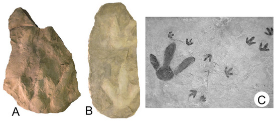 Three additional Rivavapes giganteus track specimens. (A,B) Epirelief tracks. (A) Specimen WWU-TR-059. (B) Specimen WWU-TR-57. (C) Plaster replica of track WWU-TR-059, showing the association of the giant bird track with perissodactyl mammal tracks and small shorebird tracks. Specimens A and B are on display at the WWU Geology Department; Track C remained in situ, and was destroyed in 2023 when an unauthorized collector attempted to chisel out the track from the large matrix block.