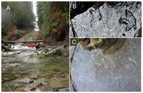 Sediments associated with the ancient meandering river were subject to facies changes caused by channel migration. These transitions are evident at both the Racehorse Creek Landslide site and the streamside exposures near Racehorse Falls. Sandstone blocks in the landslide talus field contain three separate examples of crocodilian footprint. These are typically “swim tracks” where the reptiles were traveling in shallow water [26]. The strata along Racehorse Creek likewise record channel migration. The three-track Rivavipes trackway occurs in proximity to sandstone blocks that contain molds of driftwood logs, a feature that is common to Chuckanut Formation sandbar deposits (Figure 17). A fish fossil is presumed to have come from a layer that overlies the track-bearing bedding plane [17]. A higher stratigraphic layer exposed just above Racehorse Falls has yielded fossilized unionid pelecypods [14].