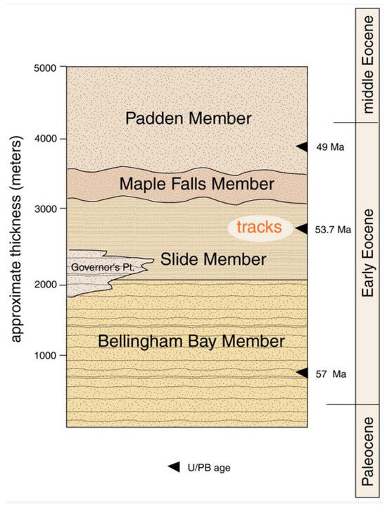 The age range of the Chuckanut Formation ranges from the Late Paleocene to the Early Eocene, based on radiometric ages from ash interbeds [16]. Several schemes have been proposed for dividing the formation into stratigraphic members [5,14,16]. The basic architecture is a three-component system composed of the Late Paleocene–Early Eocene Bellingham Bay Member, overlain in the Mount Baker foothills by the Early Eocene Slide Member, the unit that hosts all known fossil footprints. The third component is the Middle Eocene– to possibly LateEocene Padden Member, which is perhaps separated from the older members by an unconformity. The stratigraphic position of several minor members remains uncertain (Figure 11).
