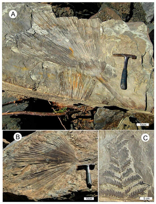 Semi-tropical plant fossils from Racehorse Creek Landslide. (A,B) Impressions of palmetto fronds, Sabalites cambelli. (C) Tree fern frond, Cyathia pinnata. Photo reprinted from [26].