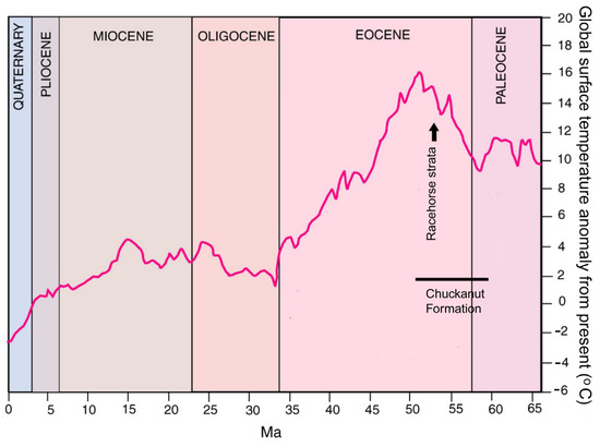 Paleotemperature plot for the Cenozoic Era, showing the warm climate that existed when the Racehorse Creek tracks were made. Graph adapted from [28,29].