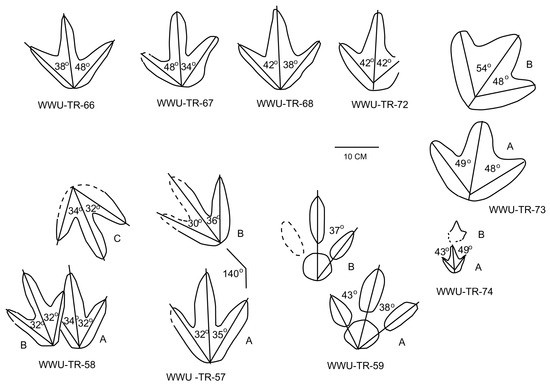 Measurements of Chuckanut Formation Rivavipes giganteus footprints are shown in Figure 14, with numerical data listed in Table 1. The geometry of the Racehorse Creek trackways is shown in Figure 15.
