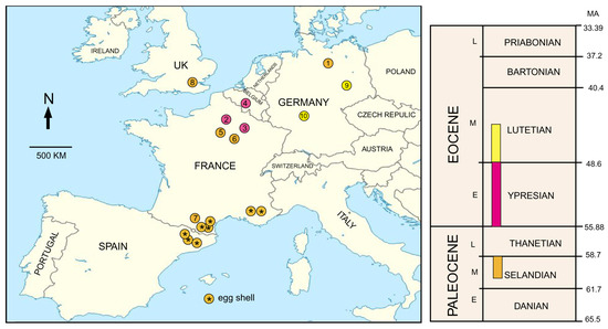 - Dughi, R.; Surgue, F. Distribution vertical des œufs d’piseaux de l’Eocène de Basse-Provence. Bull. Société Géologiquede Fr. 1962, 4, 69–78. [Google Scholar] [CrossRef]