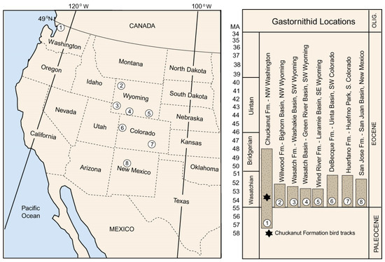 - Patterson, J.; Lockley, M.G. A probable Diatryma track from the Eocene of Washington: An intriguing case of controversy and skepticism. Ichnos 2004, 11, 341–347. [Google Scholar] [CrossRef]