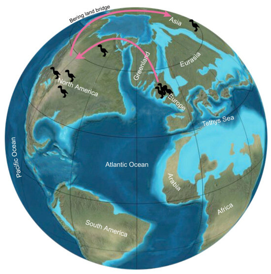 Early Eocene (50 Ma) continents, with arrows showing possible dispersal routes for gastornithids from Europe to North America and Asia. Base map adapted from [93].