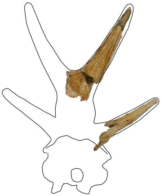 Actually, the ossicones of FRK-13 seem identical to those of Bramatherium in that there is a pair of frontoparietal ossicones arising from a common base and a pair of laterally oriented parietal ossicones (Figure 3). Two Bramatherium species are known by their ossicones, B. perimense and B. megacephalum. The main difference between the two species is that the ossicones of B. perimense are reported as stouter and shorter. FRK-13 ossicones are dimensionally closer to B. megacephalum; the anterior ossicone FRK-13a has a length of about 335–340 mm from fork to tip, similar to the anterior ossicones of B. megacephalum, which have a length of 350 mm [27]. It was not possible to precisely measure the length of the posterior ossicone FRK-13b due to the way it is broken. Bramiscus micros Ríos, Abbas, Khan & Solounias, 2024, from the Middle Miocene of Pakistan possesses similar ossicones to B. megacephalum, though much smaller.