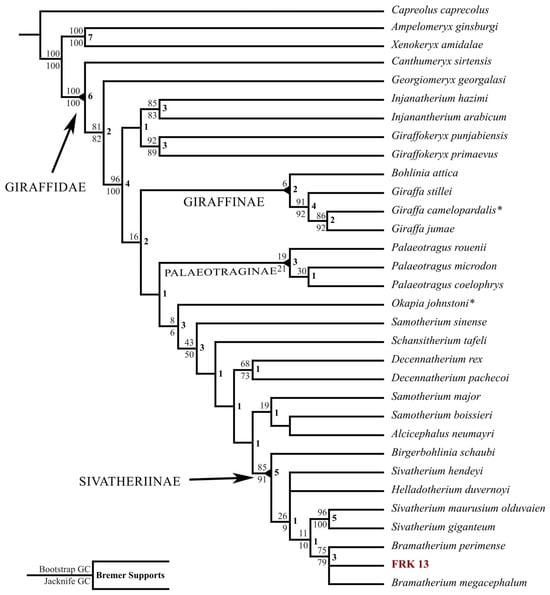 The phylogenetic analysis produced two most parsimonious trees (MPT; Figure 4) of 276 steps each, in which FRK-13 groups along with either B. megacephalum or B. perimense in a monophyletic clade. The node containing the FRK13, B. perimense and B. megacephalum, demonstrates a relatively high Bremer Support of 3 and relatively high Jacknife and Bootstrap values (79 and 75, respectively). The FRK-13 shares four synapomorphies with B. megacephalum and B. perimense: they have no Decennatherium-like ossicone core, the anterior ossicones are fused at the base, the ossicones are slightly curved, and the ossicones of the anterior pair are larger than the posterior ones. These results confirm the taxonomic assignment of FRK-13 as Bramatherium although without distinguishing between B. perimense and B. megacephalum.