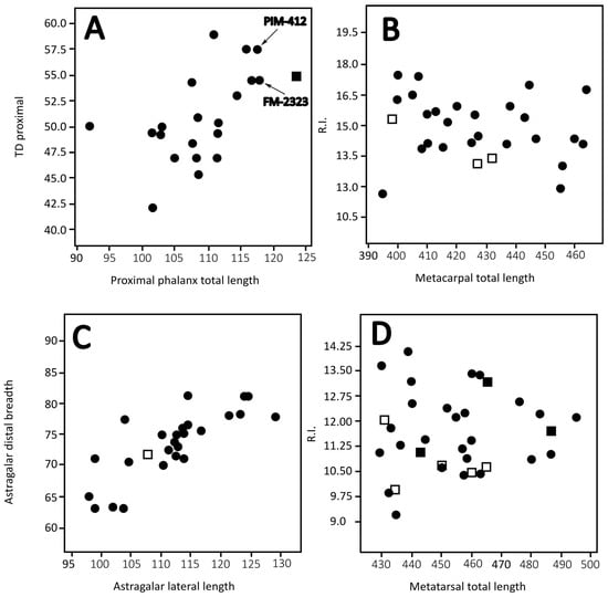 Scatter plots of the dimensions of several postcranials of Helladotherium and Bramatherium. Black circle: Helladotherium duvernoyi; black square: Bramatherium perimense; white square: Bramatherium megacephalum. Proximal Phalanx total length—proximal TD (A); Metacarpal total length—R.I. (B); Astragalus lateral length—distal breadth; (C) and Metatarsal total length—R.I. (D).