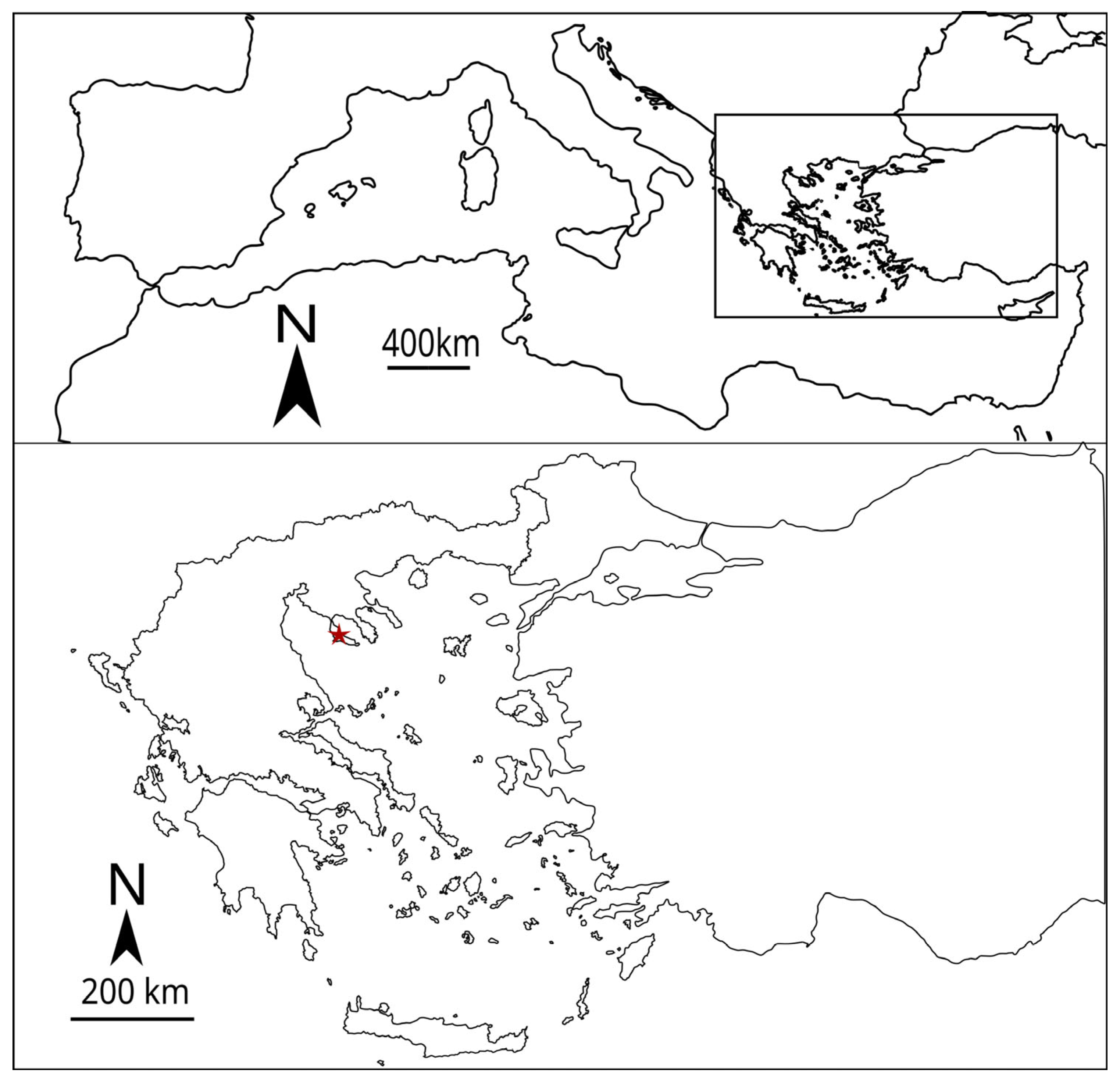 The Fourka sandpits (FRK) are distributed around the homonymous village of Fourka, in the Kassandra Peninsula of Chalkidiki (Figure 1). In this area, vertebrate fossils are usually found isolated or in small spots of a few specimens in several natural or technical outcrops. The studied ossicones (FRK13a and b) were found by the local Xanthos Makris in a natural outcrop.