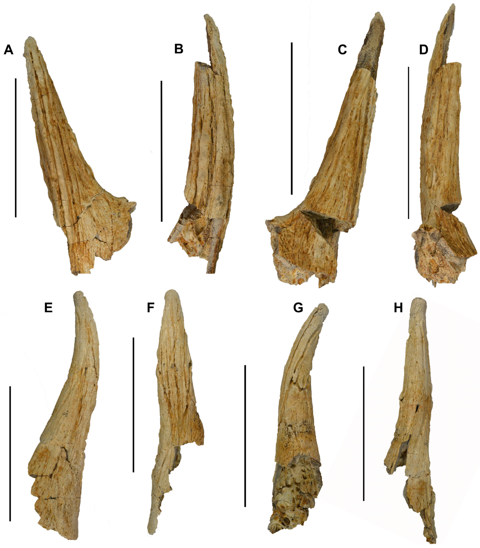 The posterior ossicone (FRK-13b; Figure 2E–H) is broken towards its base; however, it seems that it was pneumatized at that area, with several sinuses being observed. It is rather unlikely that it was arising from a common base with the other posterior ossicone, as is the case in the anterior part. Moreover, it is more curved than the anterior ossicone, its interior is hollowed, and its cross section is circular to oval. It seems to be shorter and slenderer than the anterior ossicone. Unfortunately, its orientation cannot be safely traced. Its surface is also heavily textured (less than the anterior though), with numerous grooves, ridges, bumps, and pits of varying degrees of development. Its apex seems similar to that of the anterior ossicone, being finely textured and not more expanded than the shaft of the ossicone.