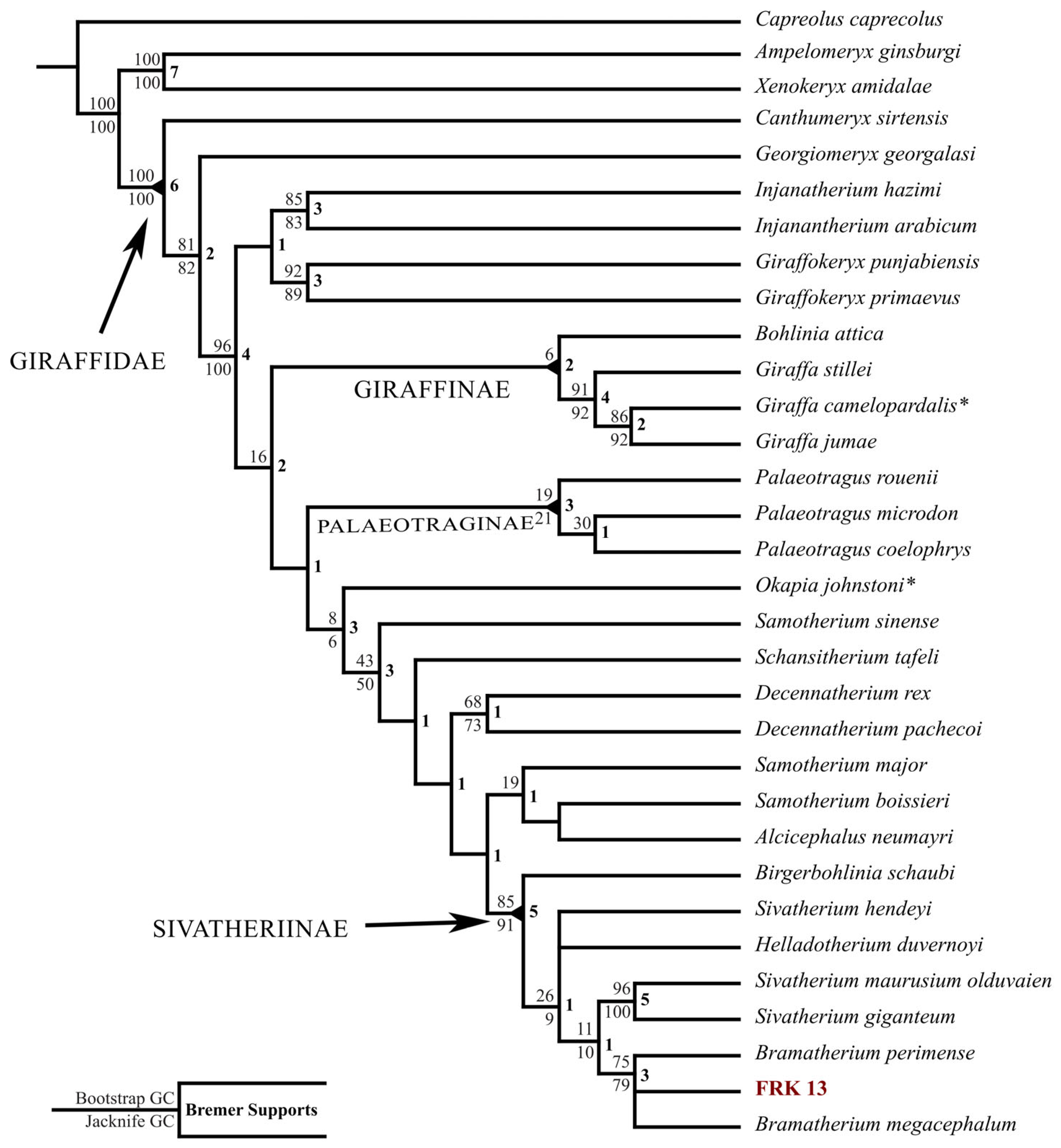 The phylogenetic analysis produced two most parsimonious trees (MPT; Figure 4) of 276 steps each, in which FRK-13 groups along with either B. megacephalum or B. perimense in a monophyletic clade. The node containing the FRK13, B. perimense and B. megacephalum, demonstrates a relatively high Bremer Support of 3 and relatively high Jacknife and Bootstrap values (79 and 75, respectively). The FRK-13 shares four synapomorphies with B. megacephalum and B. perimense: they have no Decennatherium-like ossicone core, the anterior ossicones are fused at the base, the ossicones are slightly curved, and the ossicones of the anterior pair are larger than the posterior ones. These results confirm the taxonomic assignment of FRK-13 as Bramatherium although without distinguishing between B. perimense and B. megacephalum.
