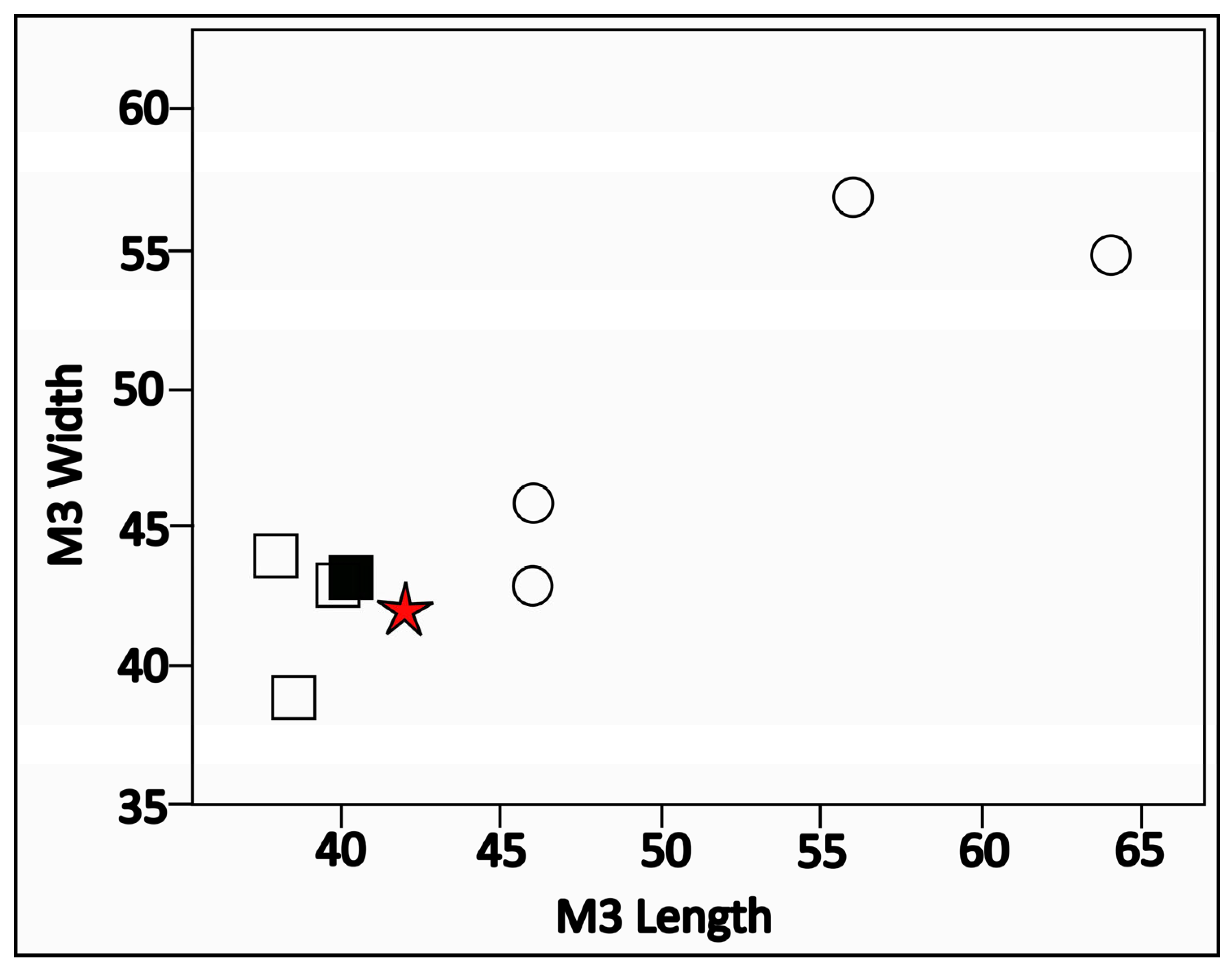 Figure 5. Scatter plot with the dimensions of the M3 of various Bramatherium species. White square: Bramatherium megacephalum; black square: Bramatherium perimense; white circle: Bramatherium grande; red star: AMPG(V)-110.
