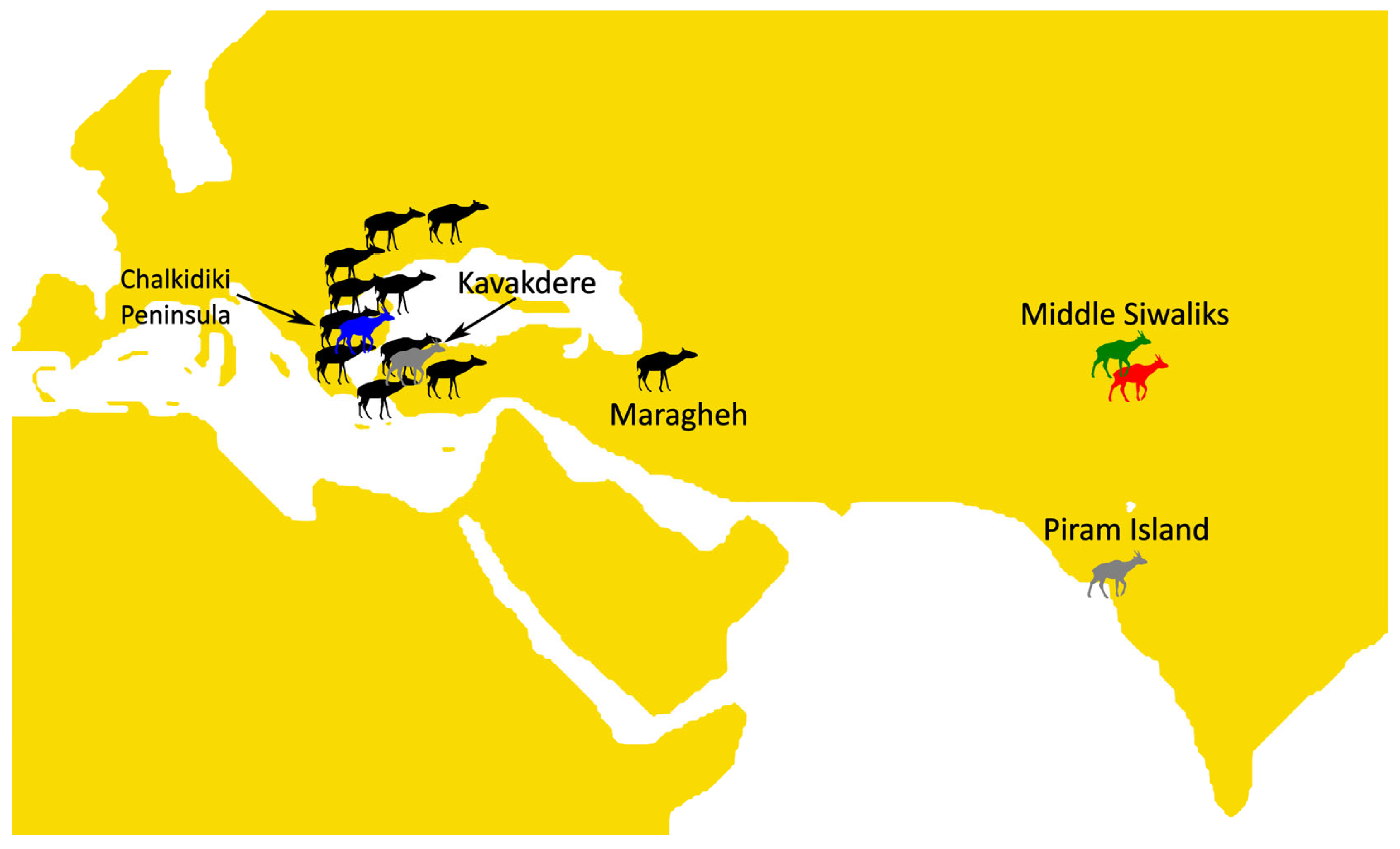 Figure 6. Late Miocene map showing the distribution of the large sivatheres. Black sketch: Helladotherium duvernoyi; gray sketch: Bramatherium perimense; red sketch: Bramatherium megacephalum; green sketch: Bramatherium grande; blue sketch: FRK Bramatherium. Map adapted from Ríos et al. [34]. Bramatherium silhouette by Steven Traver, adapted and licensed under CC0 1.0 “https://creativecommons.org/publicdomain/zero/1.0/ (accessed on 8 July 2025)”. Helladotherium silhouette by Zimices (Julián Bayona), adapted and licensed under CC BY-SA 3.0 “https://creativecommons.org/licenses/by-sa/3.0/ (accessed on 8 July 2025)”.