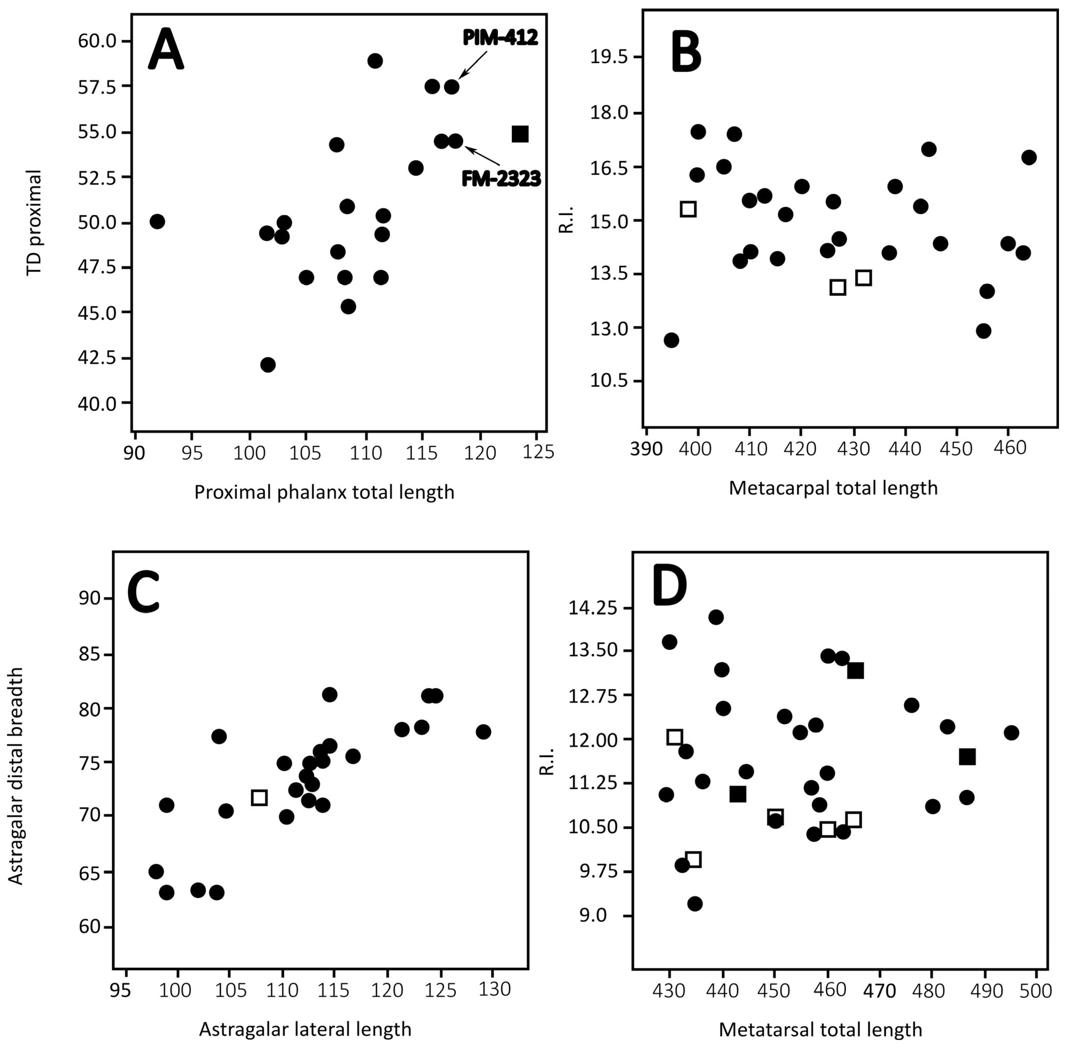Figure 7. Scatter plots of the dimensions of several postcranials of Helladotherium and Bramatherium. Black circle: Helladotherium duvernoyi; black square: Bramatherium perimense; white square: Bramatherium megacephalum. Proximal Phalanx total length—proximal TD (A); Metacarpal total length—R.I. (B); Astragalus lateral length—distal breadth; (C) and Metatarsal total length—R.I. (D).