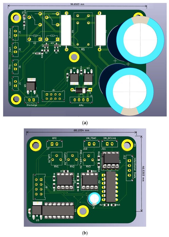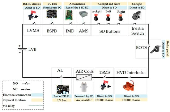- The low-voltage (LV) system: This comprises the electronic system responsible for operating and controlling the HV systems within the FSERC. It usually operates at low voltage (LV) levels ranging from 6V to 24 V, with 12 V being a common value. The LV control system (LVCS) consists of various electronic circuits (ECs) assigned to different functions within the FSERC. These ECs are distributed across nearly every subsystem to fulfil a range of tasks, including toggling operations on/off, issuing warnings, transmitting data, or executing safety routines.