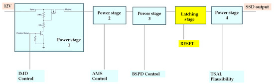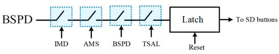 - LV master switch (LVMS): this is an NO switch responsible for linking the LVB to the remainder of the line. The first EC connected to the SD line is the brake system plausibility device (BSPD), which will be presented alongside the other ECs in subsequent subsections.