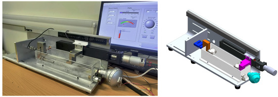 In order to simulate in vivo conditions, test samples are generally maintained wet by constantly spraying the surface with phosphate-buffered saline solution (PBS) or applying a layer of petroleum jelly (Vaseline). In BRAUTENSE, the use of a test chamber enables the samples to be submerged in water or a physiological saline solution during testing at the desired liquid temperatures. The chamber system is shown in Figure 5. The chamber’s material is PMMA (polymethyl methacrylate), which provides good insulation characteristics as well as transparency, and is convenient for visual inspection and eventual video recording of the experiments. The interior length of the chamber is , resulting in an effective travel range of . The interior height and width are and , respectively.