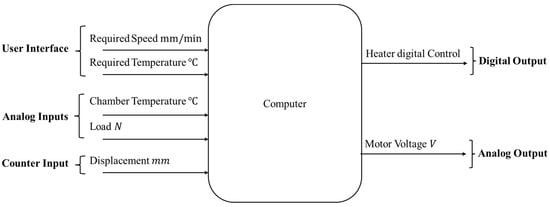 An input–output (IO) diagram of the system’s controller is shown in Figure 2. In addition to describing IOs, Figure 2 also presents the type of interface that is required for each IO. To perform the required tasks, there is a need for two analog inputs (AI), one counter input (CI), one digital output (DO), and one analog output (AO). In the presented system, a National Instruments USB-6211, which is a multifunctional data acquisition (DAQ) device, is used. It should be noted that any DAQ device that fulfills the IO requirements can be used instead. In addition to storing the experimental outcomes, the computer’s task is to control both the actuator’s motion and the chamber’s temperature. The following sections provide details regarding the implemented control system for each of these tasks.