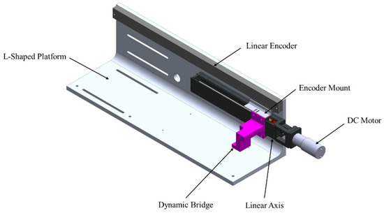 The motion system, which is shown in Figure 3, includes a DC geared motor (ROBOTZONE #638278), a linear axis with ball-screw and steel profile (HIWIN KK5002P-300A1-F3C), and a linear encoder (RSF ELEKTRONIC MSA 690.2L-2). This combination provides a traveling motion of . The DC motor is connected to the linear axis shaft using a flexible coupling. The axis slider is connected to the linear encoder using a 3D-printed part (Encoder mount). All elements are mounted to the L-shaped platform using M4 stainless steel bolts.
