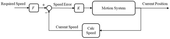 Figure 4 presents the applied control scheme for the motion system. At each time step, the controller calculates the speed using displacement measurements and then generates the control voltage command. is the feedforward gain and is the gain of the controller. In this implementation, a proportional controller is used, which results in a steady-state error. To overcome this issue, a feed-forward gain, , is calculated as follows. Assuming that the motion system is a first-order system with a steady-state gain of , the steady-state gain of the closed-loop system is given in (1).
