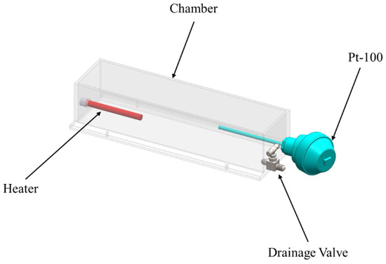 - The Plexiglass test chamber is mounted on the platform using four M4 screws. It is custom-manufactured locally, including a diameter bore for the connection of a BSP two-way brass drain valve, and two diameter bores for NPT connection of the heater and the temperature sensor (PT-100). The heater and the temperature sensor are positioned on opposite sides of the chamber.