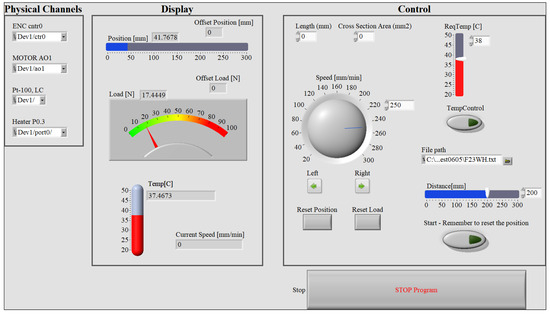 Operating the system requires connecting the model to the clamps and activating the Graphical User Interface (GUI) built for system operation and control, as shown in Figure 8. The interface is divided into three main sections: Control, Display, and Physical Channels. In the Control section, the user can characterize the desired experimental outline, update the characteristics of the specimen, manually change the position of the right dynamic clamp, and run the tests. In addition, the user can reset the values of the position and the load measurements. In the Display section, the user can see the current measured values of load, position, and temperature during the experiment, as well as the offset load and position values. In the Physical Channels section, the user should specify the physical channels of the system, as shown in Figure 2. An output file provides the measured temperature, position, and load as a function of time, as well as specimen’s dimensions (length and cross-section area), the required temperature, the required and actual linear speed, and the offset values of position and load.
