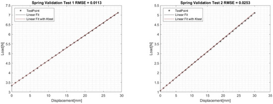 Two linear springs are utilized to validate force-displacement measurements. For each spring, the force and the displacement are recorded. Then, the expected force is calculated for each recorded position using the known spring constant and the initial recorded point. Finally, the Root Mean Squared Error (RMSE) between the actual and the expected forces was calculated. The results of these validation tests, analyzed using a MATLAB script, are presented in Figure 9. In the figure, the force-displacement curves, as recorded during these validation tests, are shown as black asterisks. The black curves are the linear fit of the obtained points, whereas the red curve represents the expected force values. The obtained low RMSE values, also given in the figure, suggest that BRAUTENSE can accurately measure both force and displacement.