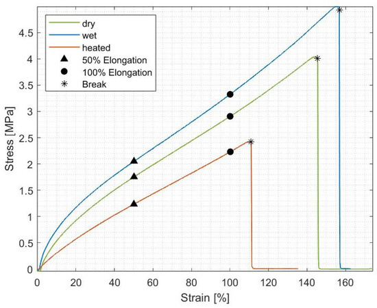 As the average temperature is increased from to in wet conditions, stresses and elongation at break decreased drastically. The average maximal stress decreased from at to at (i.e., by 43.7%), and the average elongation at break decreased by 63.6% (from at to at ).