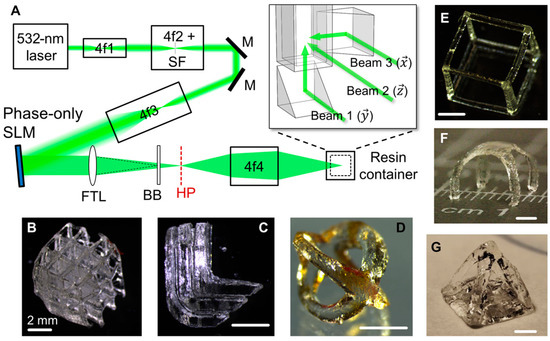 - Kelly, B.E.; Bhattacharya, I.; Heidari, H.; Shusteff, M.; Spadaccini, C.M.; Taylor, H.K. Volumetric Additive Manufacturing via Tomographic Reconstruction. Science 2019, 363, 1075–1079. [Google Scholar] [CrossRef] [PubMed]