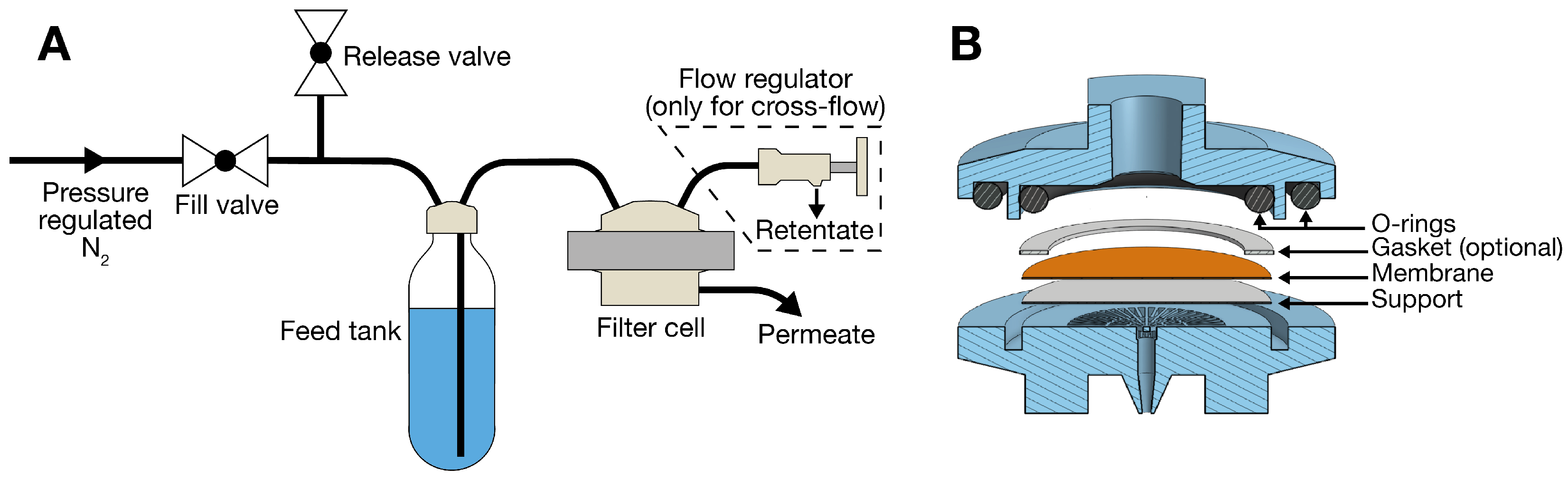 Figure 1). It consists of a top and a bottom housing held together by a KF-25 ring clamp. The clamp is tightened with a single wingnut facilitating rapid replacement of the membrane. A ring in the top housing and a groove in the bottom housing align the two halves of the cell when assembled. The membrane is placed on a grid in the bottom housing, which collects permeate into an outlet channel. The dead-end cell features a fitting in the top housing for connecting the feed inlet tube, and a permeate outlet nozzle in the bottom housing. The cross-flow cell has an additional retentate-outlet tube connection in the top housing and uses a tube for its permeate outlet as the cell must sit on a magnetic stirring plate. A stirring bar retained by a stainless-steel wire is suspended from a beam that is press-fit into a socket at the top of the cell, allowing the bar to rotate freely without contacting the membrane.