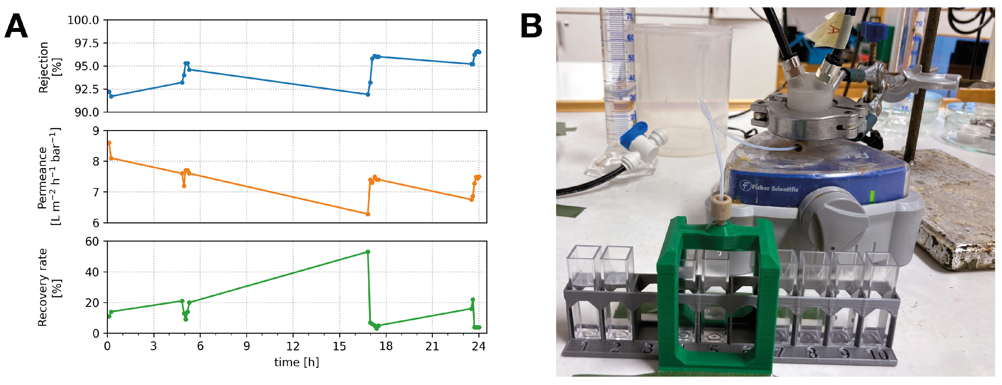 −1 depending on the model), but the rejection rate was lower than the 99.5% specified by the manufacturer. A 99.5% rejection rate is expected from standardized evaluation in a well-designed conventional cross-flow setup that efficiently introduces feed solution at one end of the cell and removes retentate at the opposite end. The lower rejection rate achieved by our setup is attributable to less efficient replenishment of the feed solution in the cell, which leads to increased concentration polarization—a higher effective solute concentration at the membrane surface. This is further exacerbated by periods of operation at the above-target permeate recovery rate. The setup was also evaluated using the same membrane and operating pressure, filtering a 10 mg L