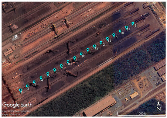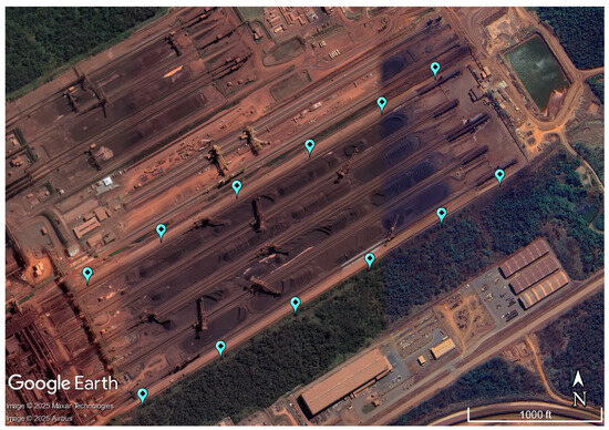 The final prototype test aims to collect RSSI parameters at specific points within the product storage yard to generate the REM using Kriging interpolation. A stacker machine with recurrent wireless network connection issues was deliberately chosen to ensure that the REM would provide results directly applicable to the operation. As the stacker moves along a straight rail, monitoring points are set at 50 m intervals along the rail to ensure accurate tracking of its movements, as illustrated in