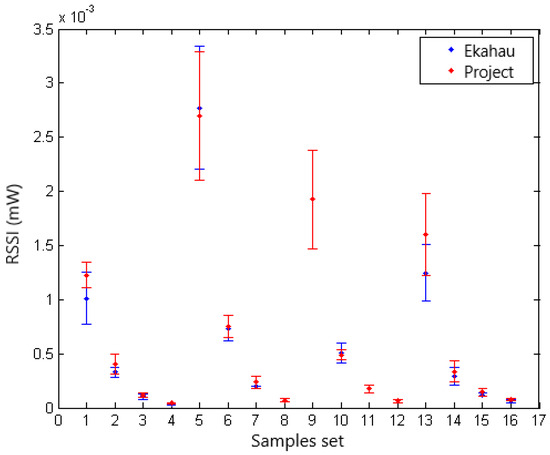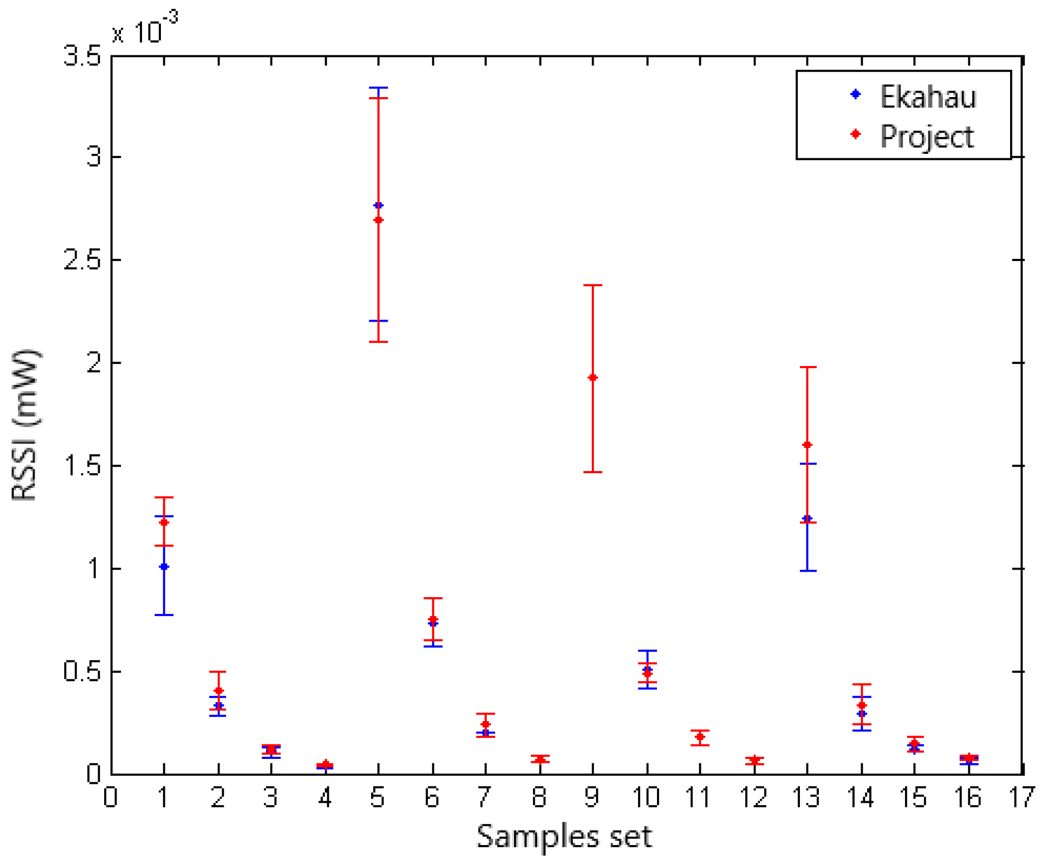 One point to note is that the error bars for all 16 sample sets intersect, indicating that the sample measurements between the Ekahau Site Survey and the developed prototype are equivalent. It is further emphasized that the error bars in sets 1, 5, 9, and 13 are larger due to the logarithmic nature of RSSI, as this parameter was obtained in dBm by both Ekahau and the prototype during testing and was subsequently converted to mW in the representation shown in