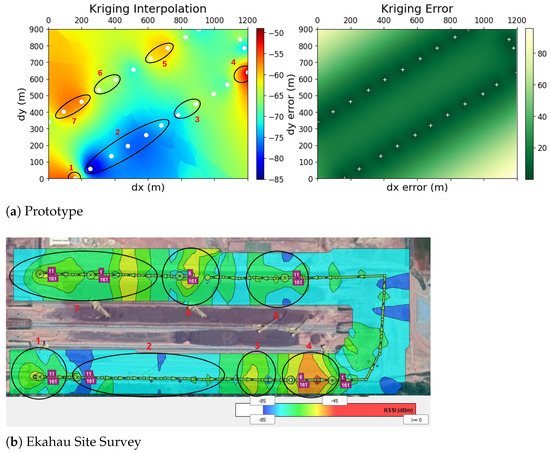 28]. We used the RSSI measurements collected from the 23 points as input in this task. Interpolation via Ordinary Kriging was calculated for points every 10 m.