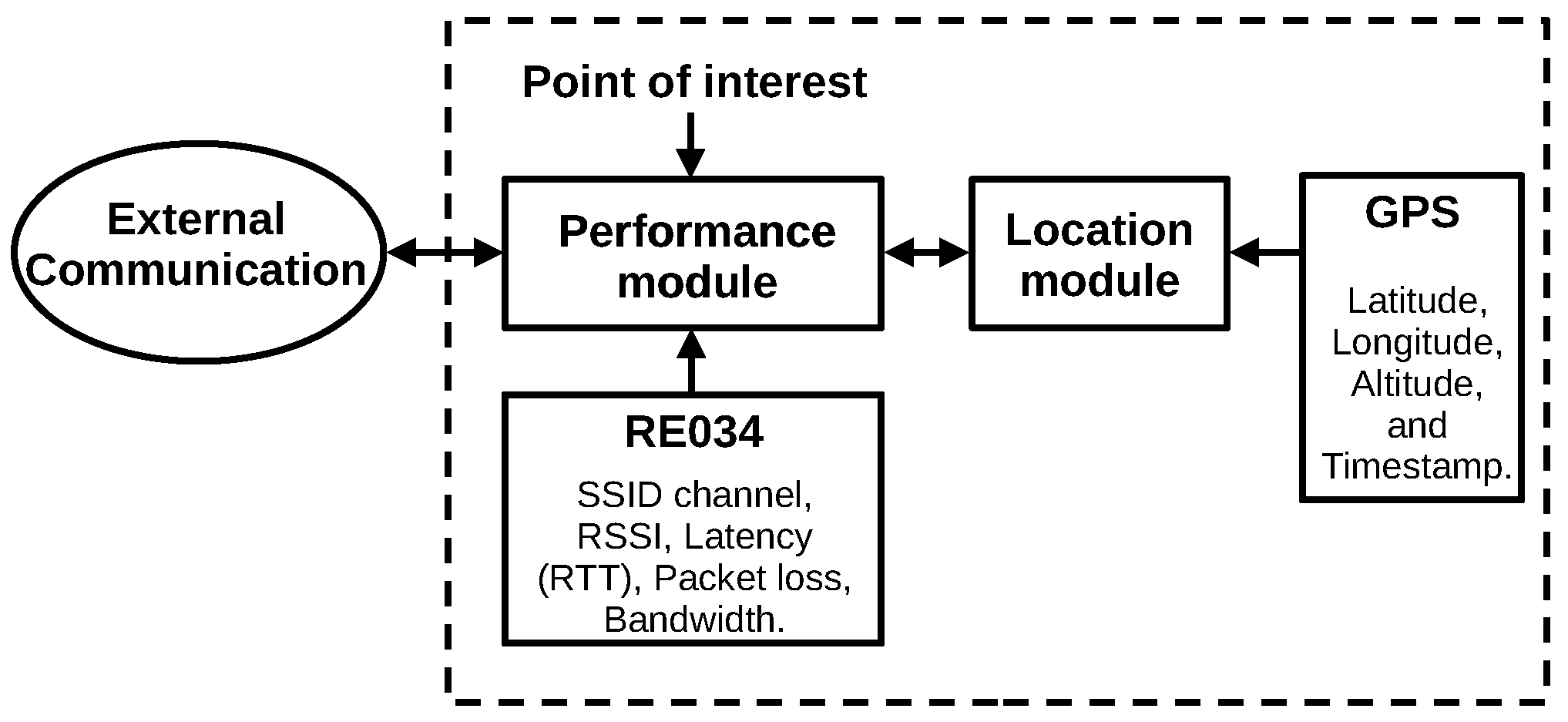 The monitoring system comprises the following two modules: the “location” module, which aims to capture geographic coordinates, and the “performance” module, responsible for recording the network signal and performance data. The quality status of the wireless network monitored by the platform consists of measuring the following parameters: