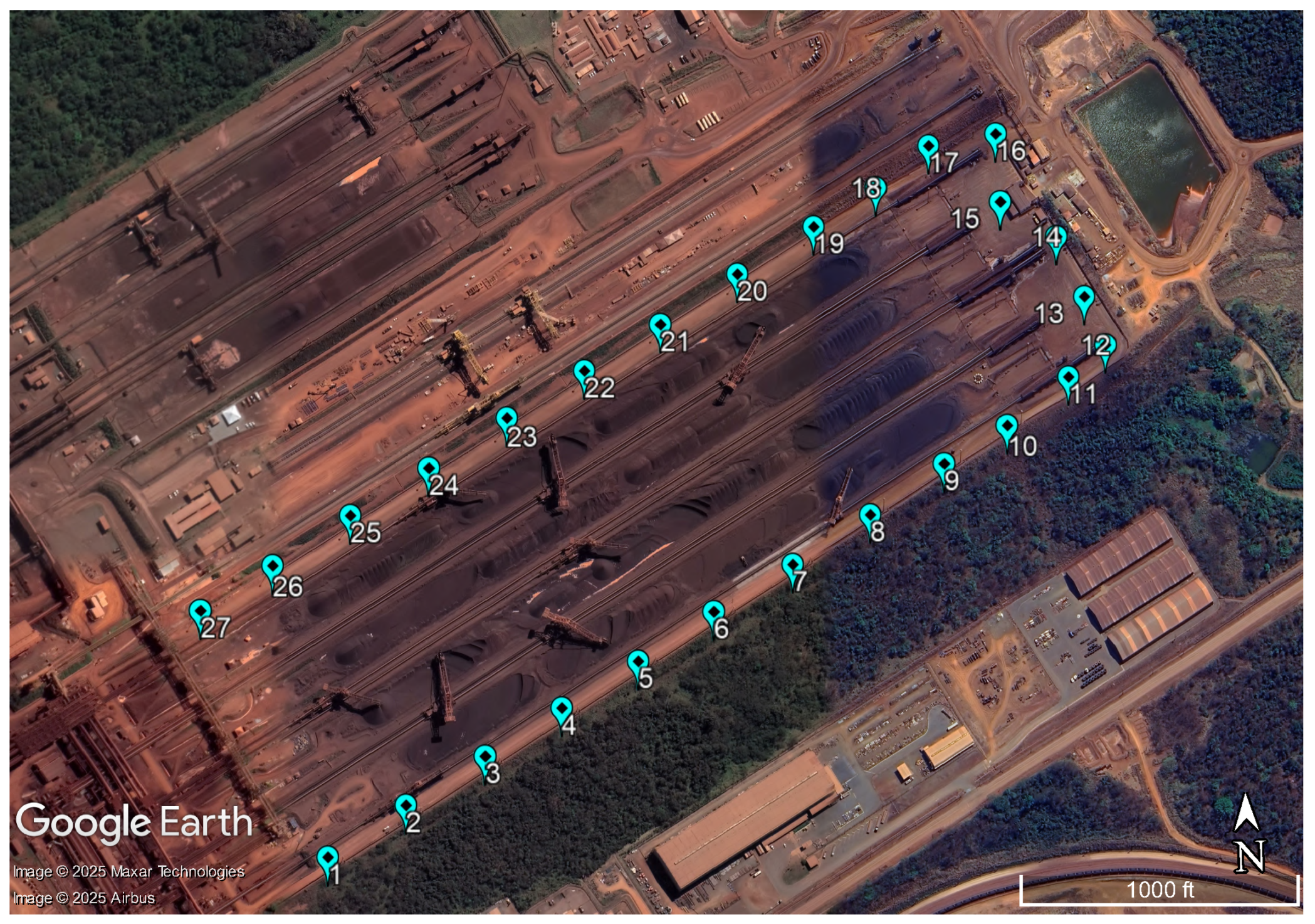 The field tests to compare the prototype with the Ekahau Site Survey, Vale’s official wireless network monitoring tool, were performed during a visit to the processing plant of the S11D complex. The test consisted of traveling between 27 points of interest distributed around the stockyard (see
