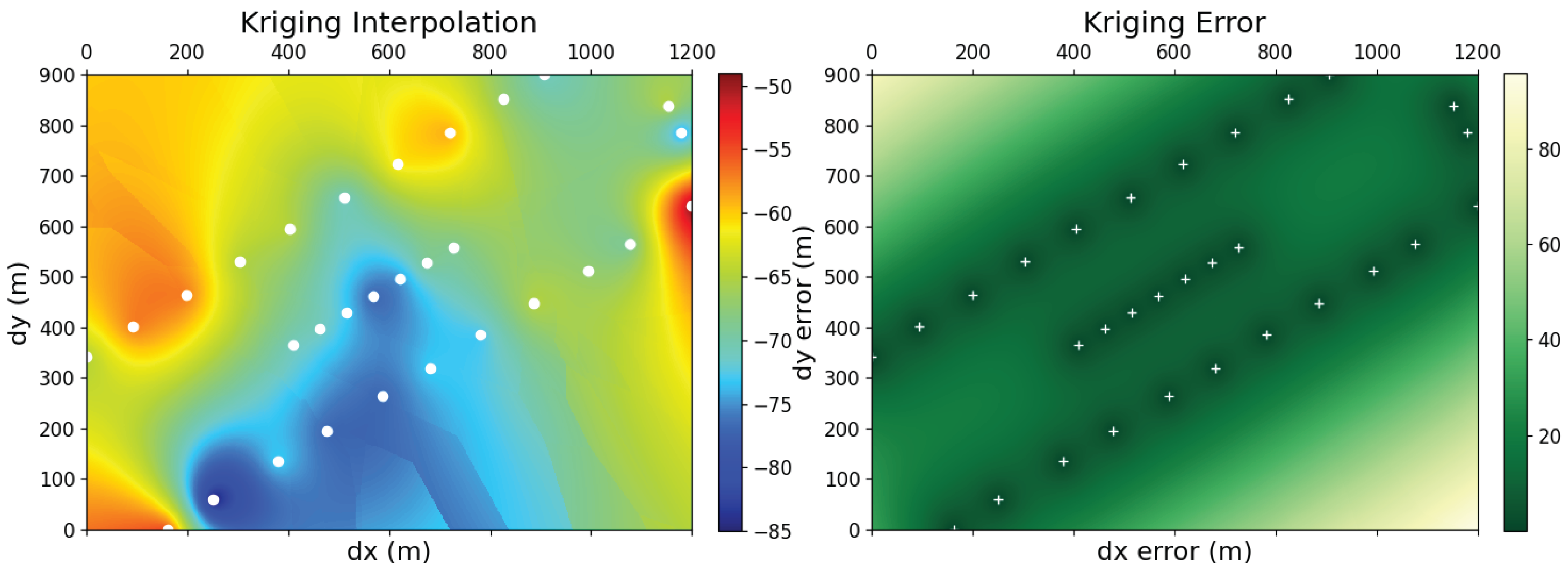 16]. Unlike other alternatives, Kriging also quantifies prediction uncertainty, offering variances that help assess the reliability of interpolated values [