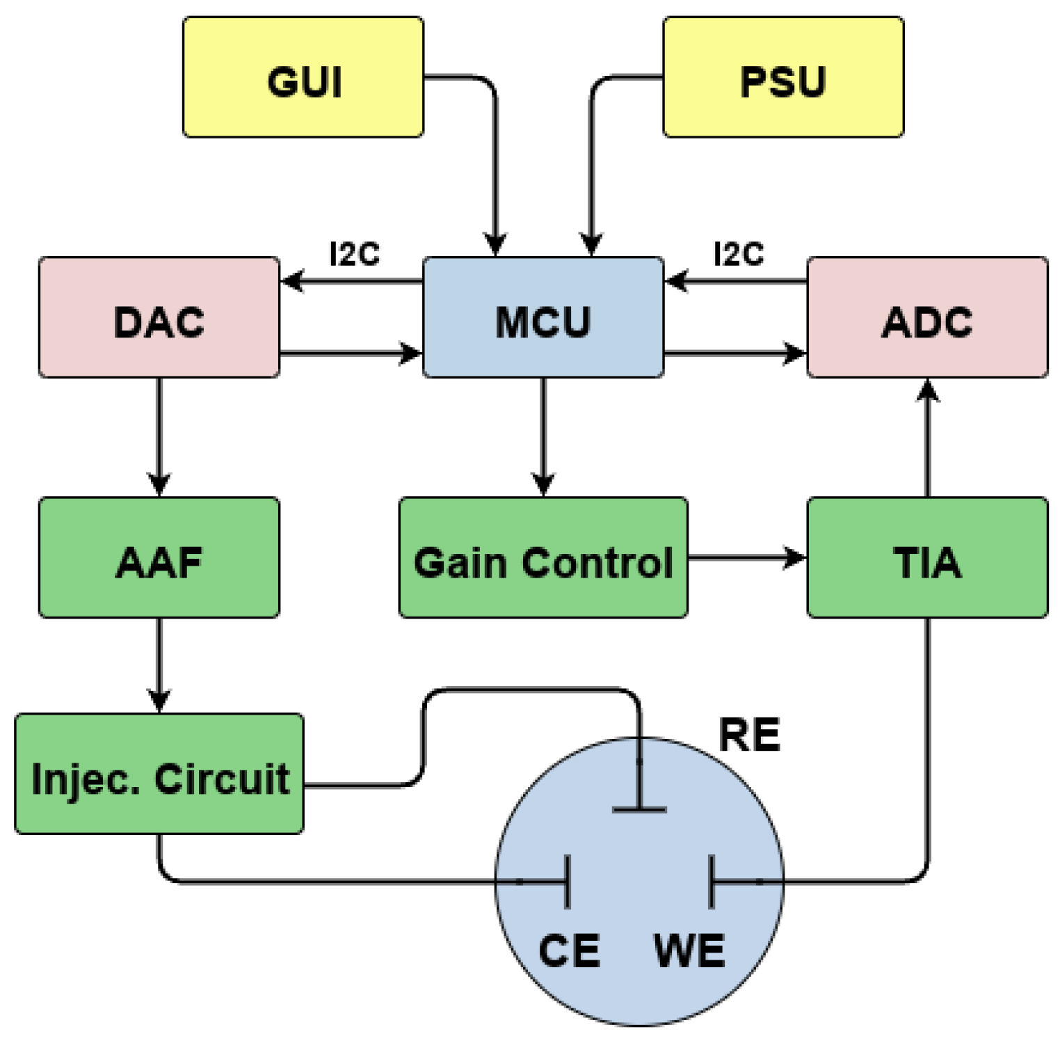 Figure 1, shows the system components. It includes a digital-to-analog converter (DAC), an analog-to-digital converter (ADC), an anti-aliasing filter (AAF), a transimpedance amplifier (TIA) with gain control circuit, and a potential control circuit for the electrodes. It necessarily includes a microprocessor controller unit (MCU), which, for this design, should be able to run a general-purpose operating system, and a power supply unit to feed the entire instrument.