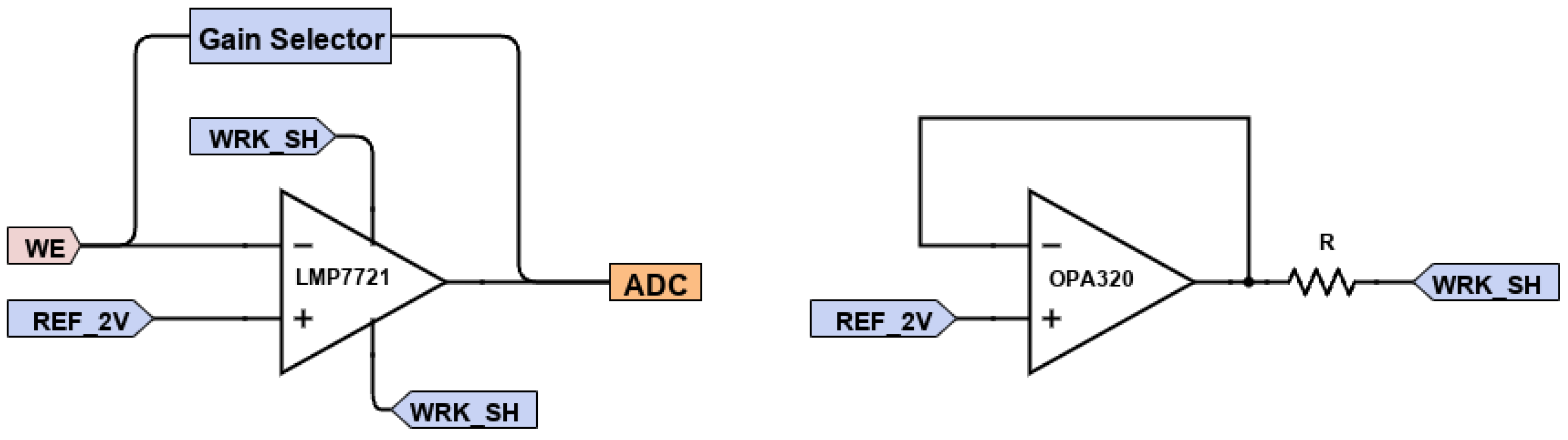 Amplifier circuits include the electronics in charge of controlling the potential and measuring the current in a three-electrode system. The most critical is the working electrode circuit, because it is positioned where the electrochemical reaction of interest takes place. Therefore, it must have the highest sensitivity and the best quality components [