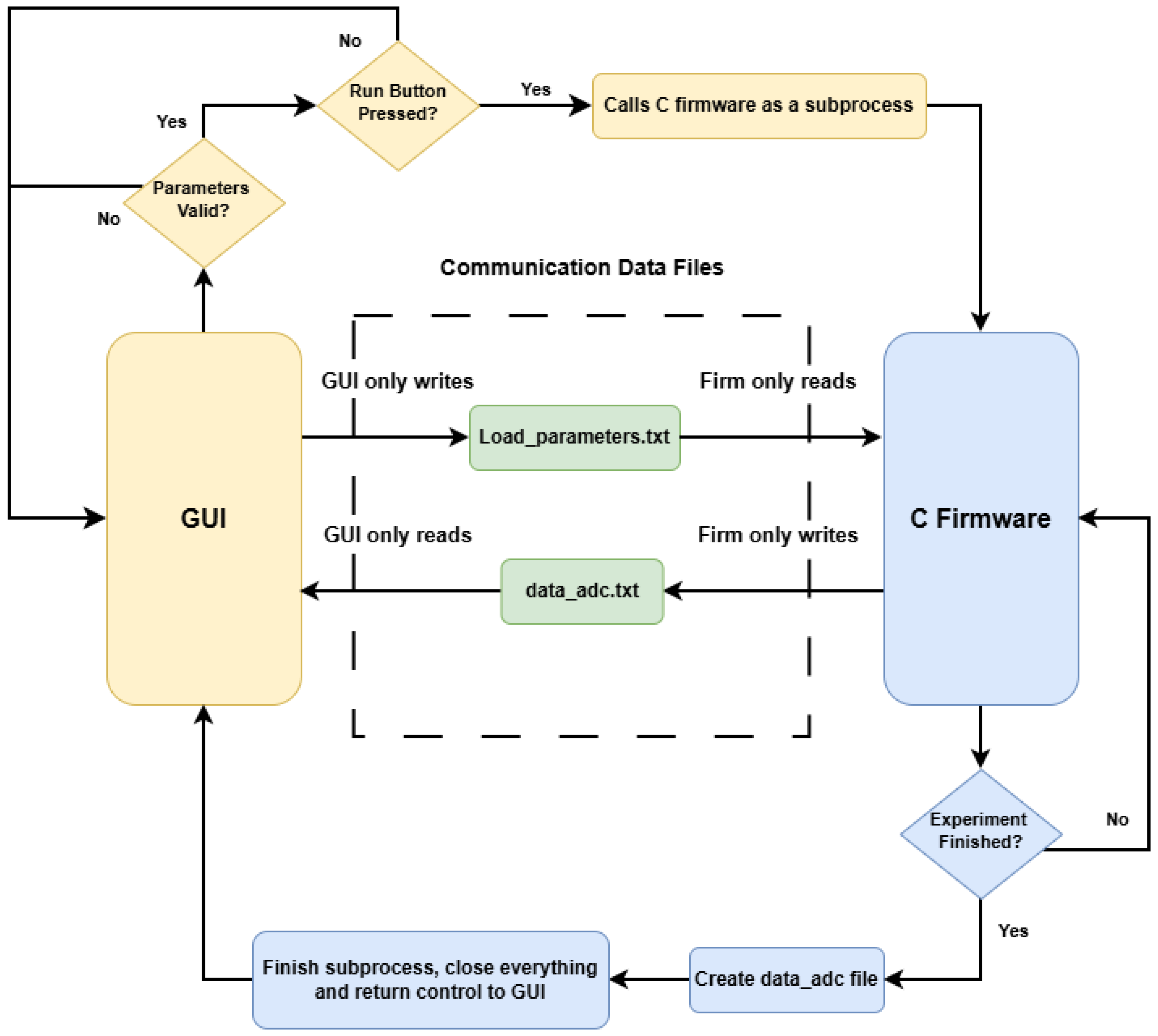 To maintain simplicity, communication between the GUI and the firmware relies on a text-based file exchange mechanism. The GUI generates a configuration file, Load_parameters.txt, which is strictly write-only for the GUI. The firmware reads this file upon initialization to load the experimental parameters but does not possess write access. Conversely, the firmware logs all measurement data into data_adc.txt. This file is write-only for the firmware; once the acquisition process concludes, the GUI parses this file to update the graphical visualization.