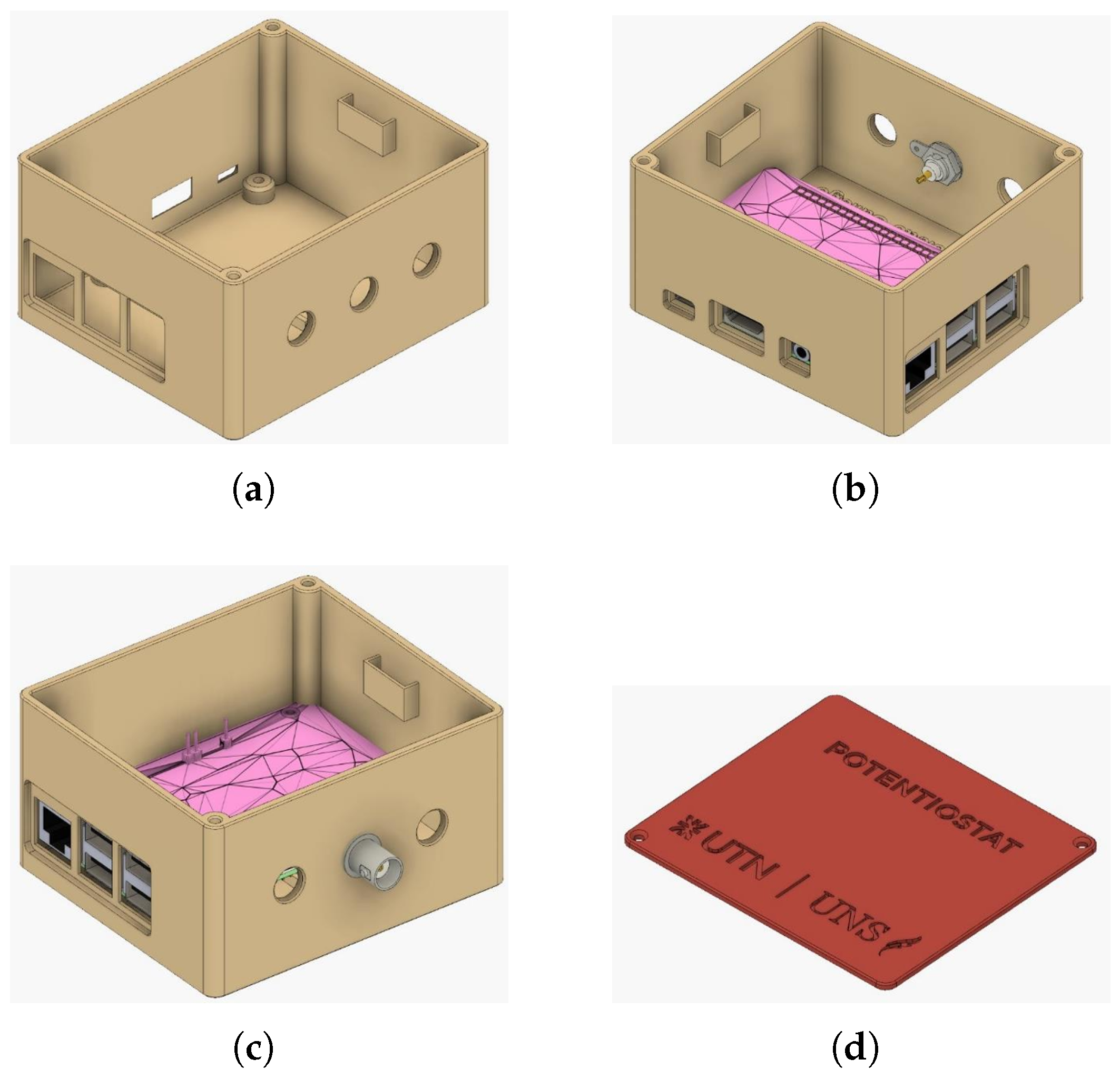 The whole case design renders can be explore in this figure: (a) Empty case exterior and interior visualization. (b) Rotated case visualization with Raspberry, the potentiostat PCB and a BNC connector mounted in the case. (c) Case front view with some mounted components. (d) Case cover design.