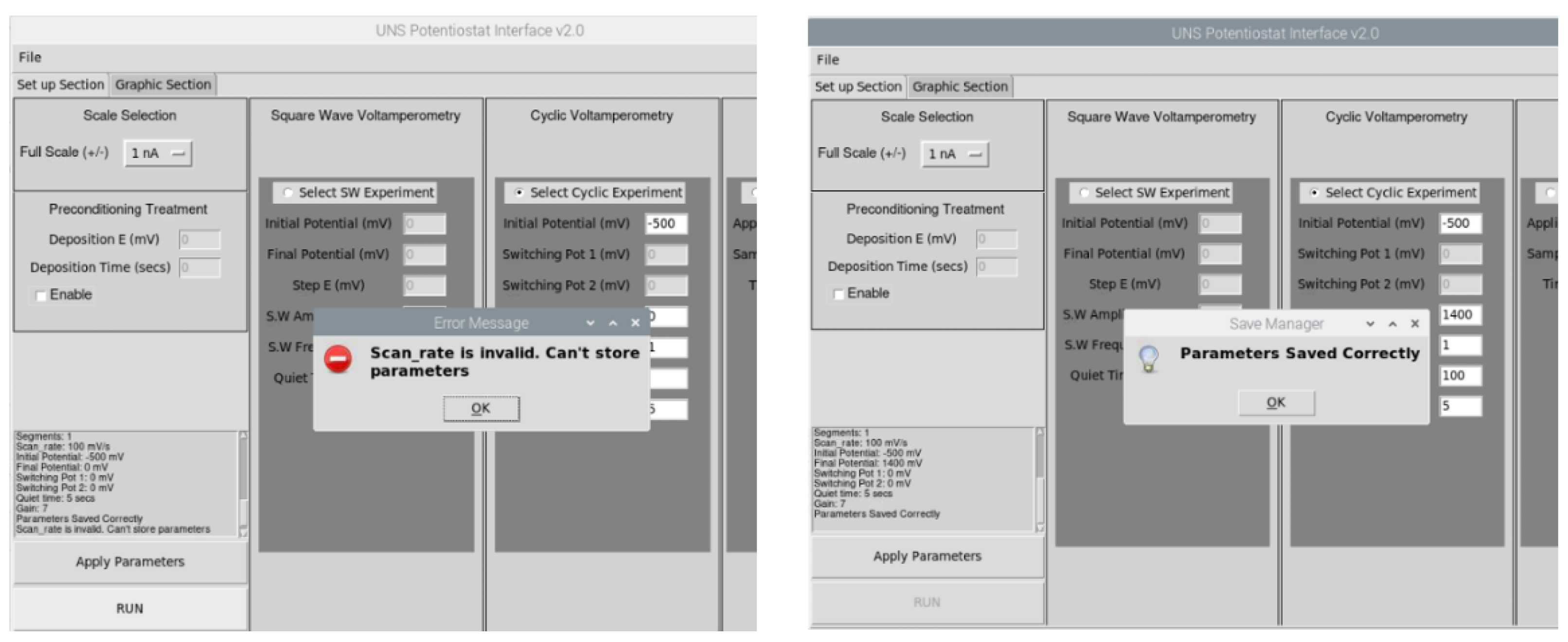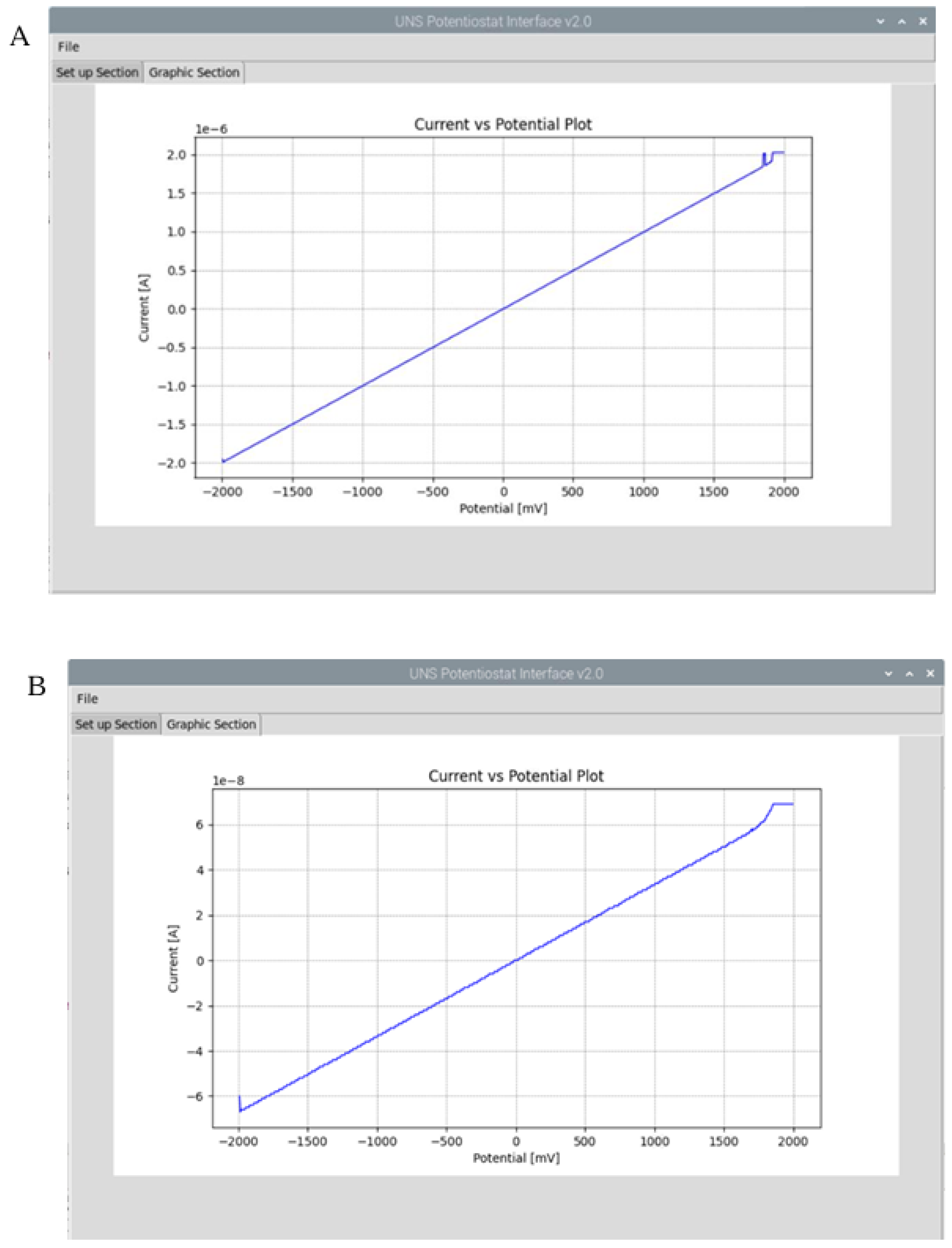Linearity experiments with dummy cells. Potentiostat GUI screenshots. (A) Dummy cell with 1 M resistor. (B) Dummy cell with 30 M resistor.