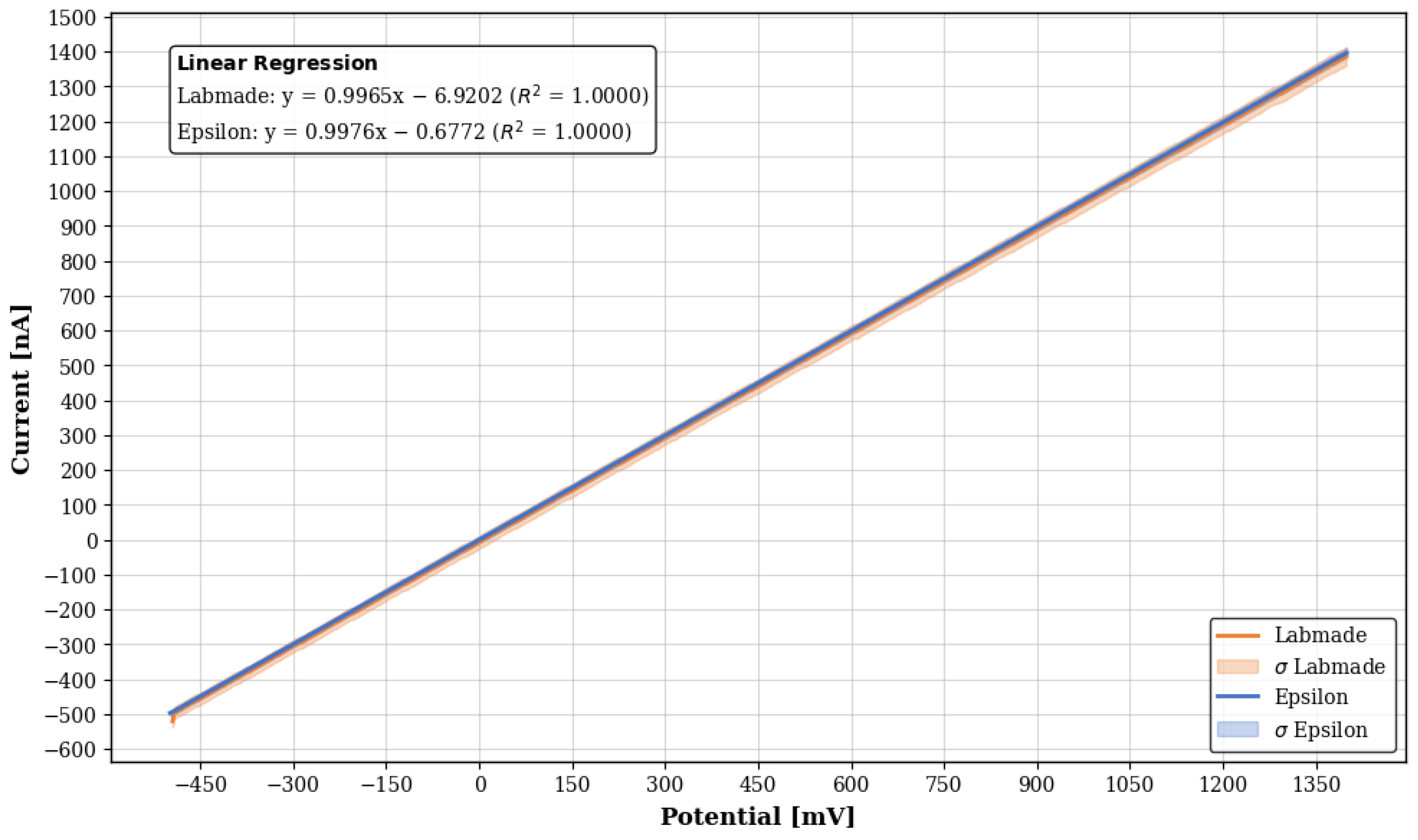 Linearity comparison between lab-made potentiostat and commercial equipment (Epsilon). Orange curve represents the lab-made equipment response, meanwhile the blue curve represents the commercial equipment response; shadings represents standard deviation. The linear regressions equations for each curve and their R2 coefficients are also visible in the graphic.